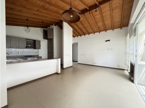 Tiene 2 alcobas con baño, biblioteca o sala de estar, 1 baño social completo, amplia cocina abierta con barra, zona de ropas independiente con ventilación natural. Amplio salón comedor y patio que tiene salida por la zona social y por la alcoba principal.